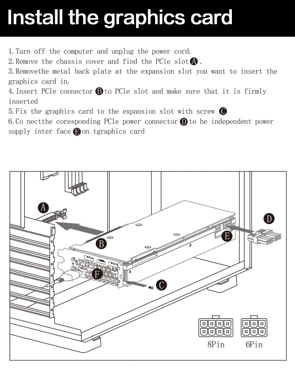6. co nectthe correspondiente PCle conector de alimentación (D) a él fuente de alimentación independiente inter cara (E) en la tarjeta gráfica